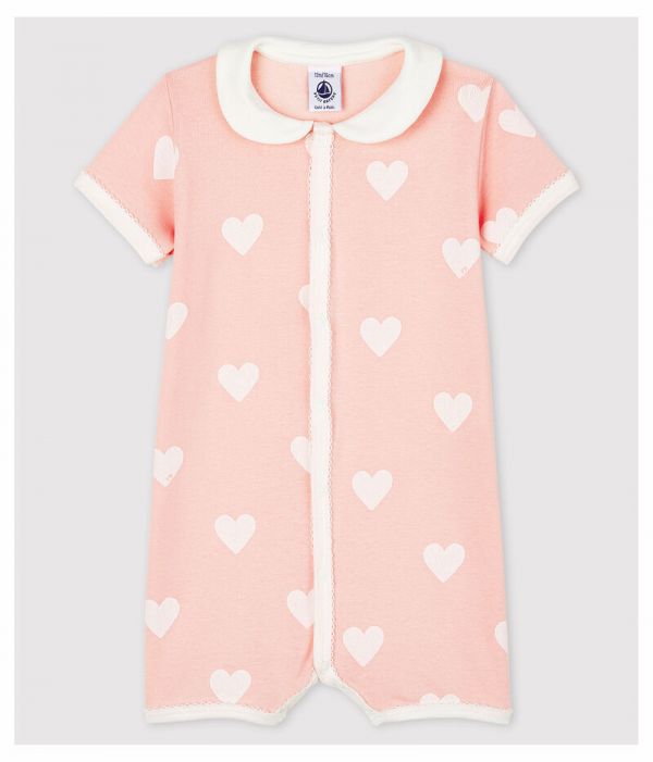 Combicourt rose à coeurs bébé fille en coton biologique. Combicourt en côte, la matière emblématique de Petit Bateau. Ouverture pressionnée sur le devant, pressions à l'entrejambe. Col claudine, colletage contrasté et finitions picots.