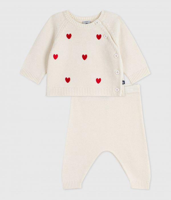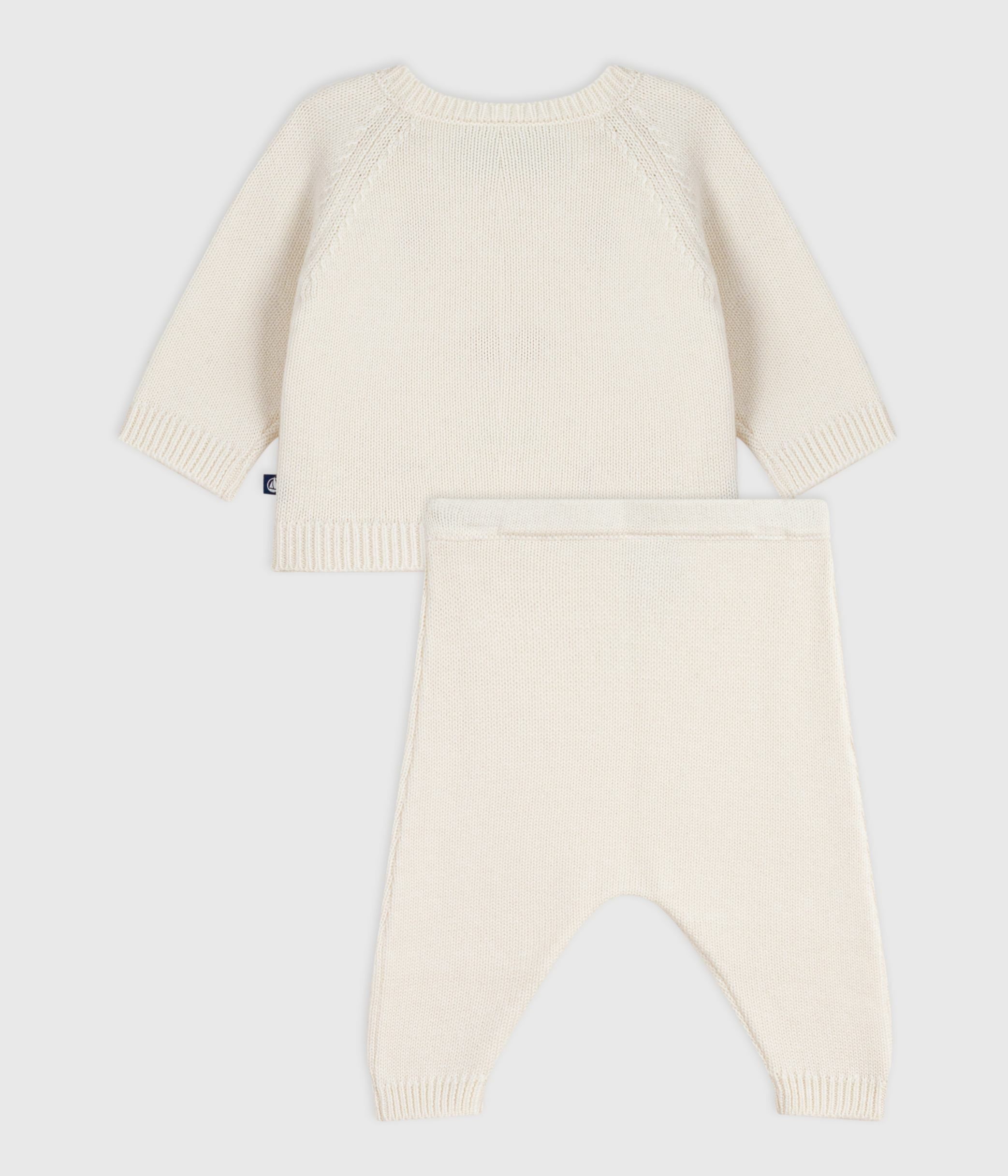 Cardigan et pantalon mixte en tricot contenant de la laine, une matière confortable pour l'hiver.
