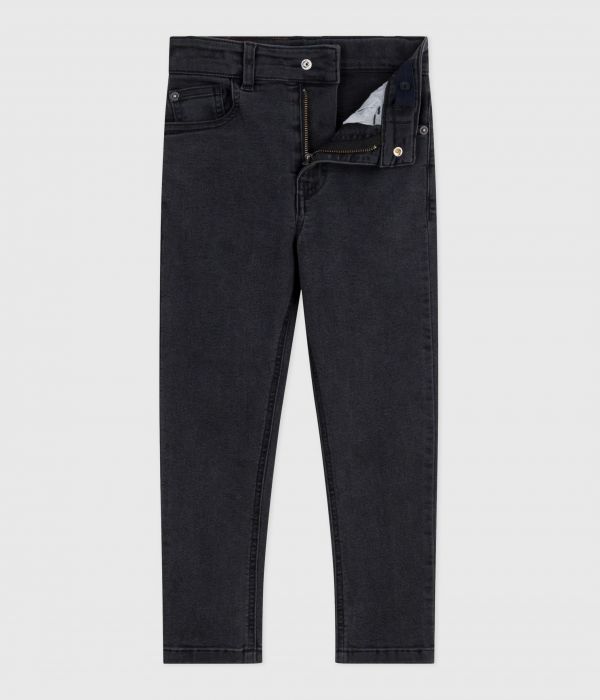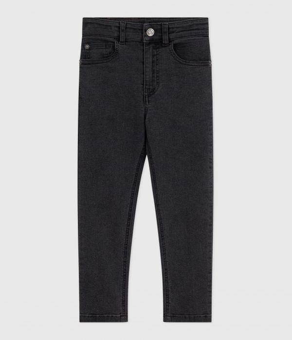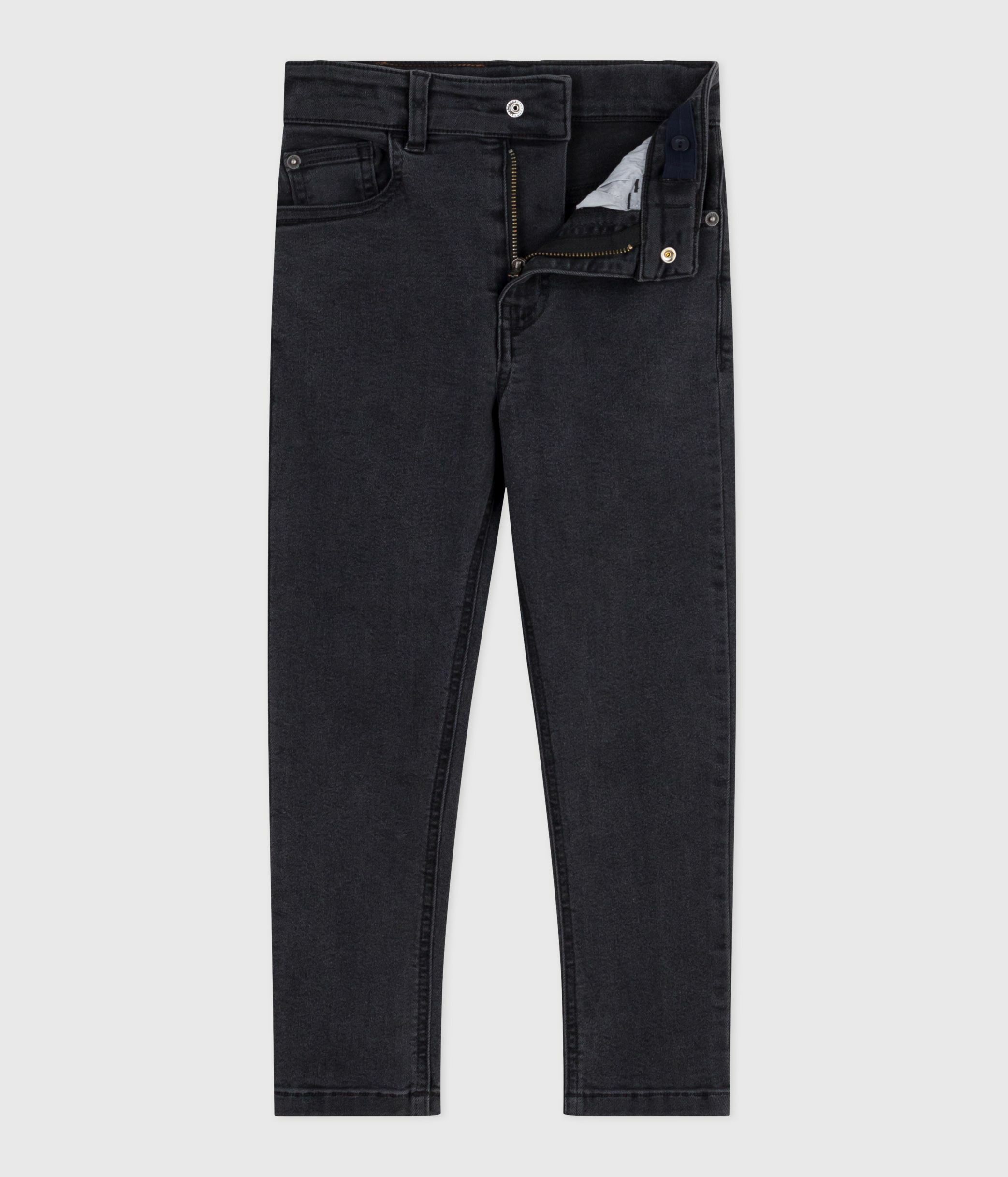 Pantalon garçon en denim extensible, au délavage noir, idéal pour tous les looks du quotidien.
