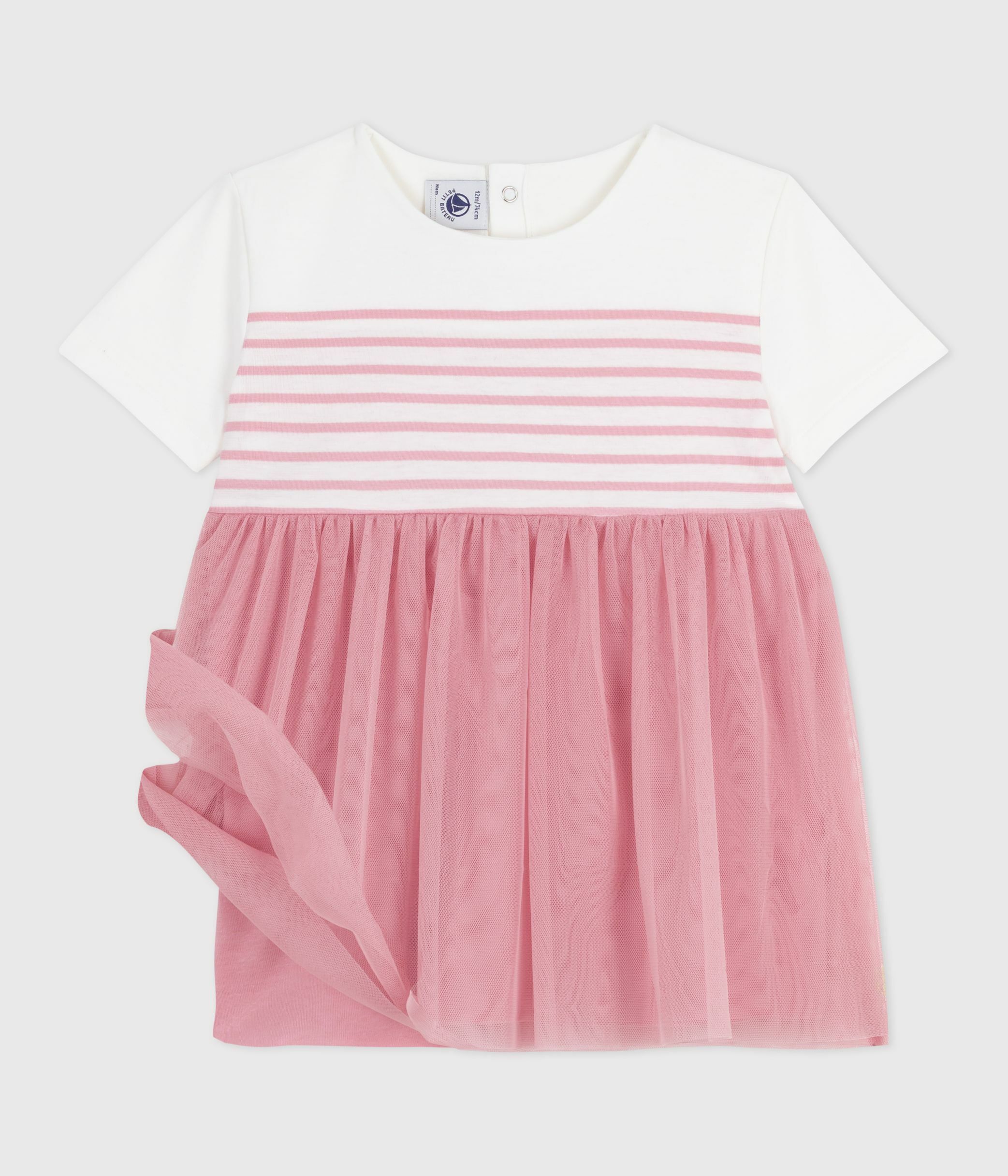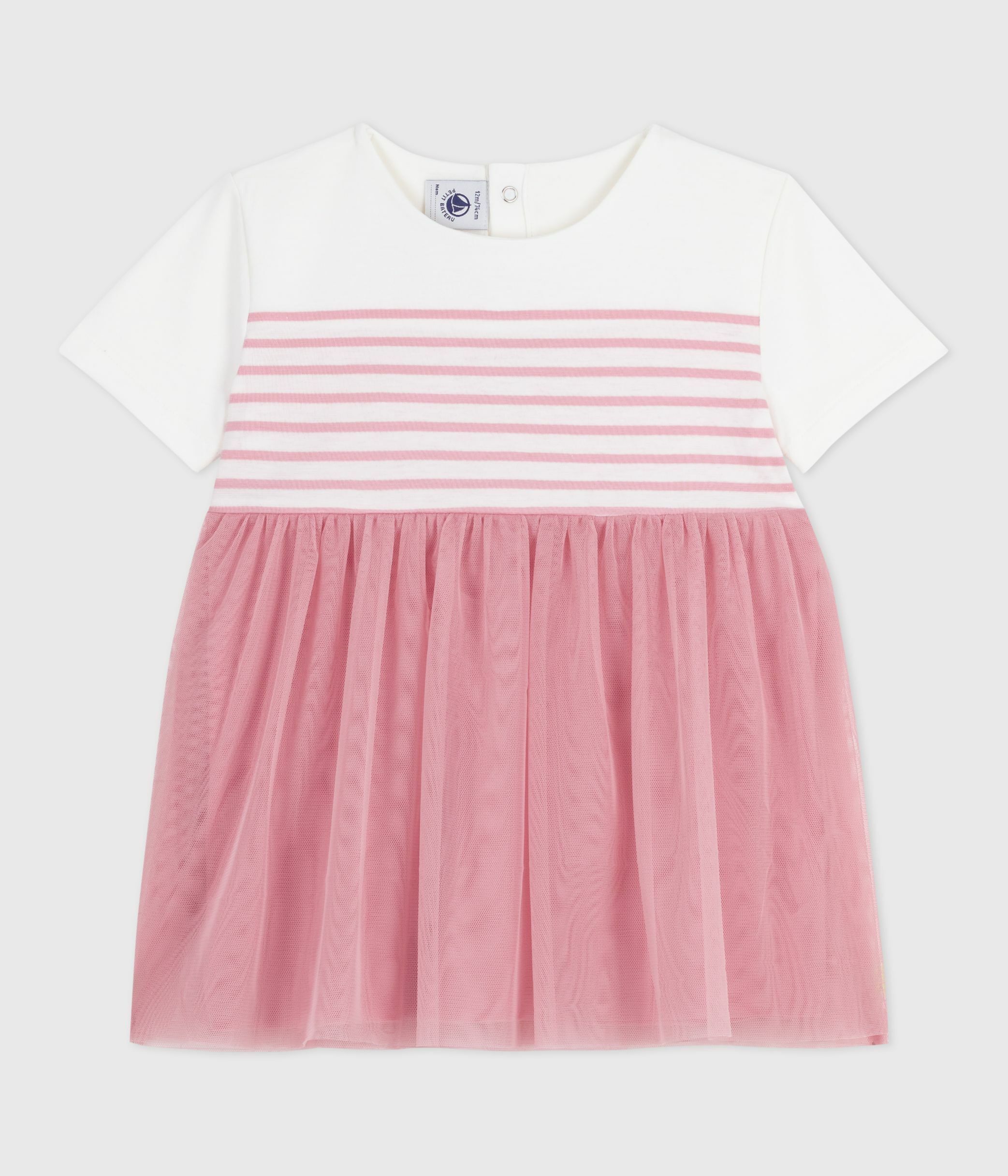 Robe fille bi-matière, jersey léger à rayures placées pour le haut, tulle uni pour la jupe.