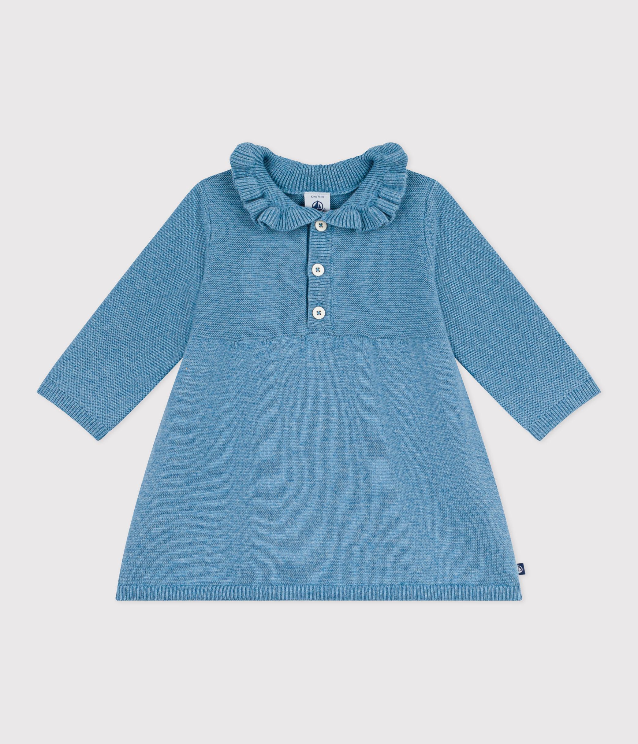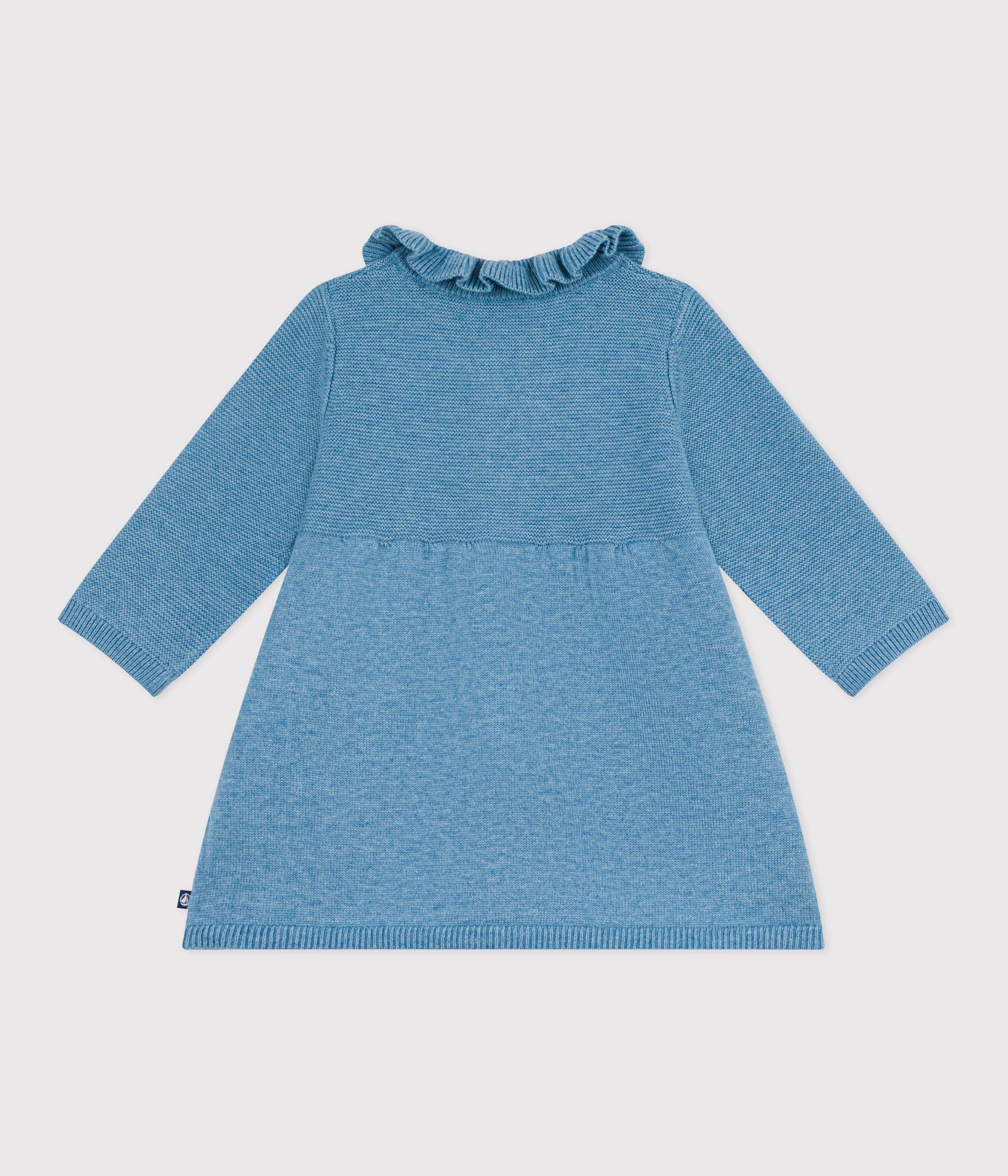 Robe fille en tricot point mousse moelleux contenant de la laine, une matière confortable pour l'hiver.