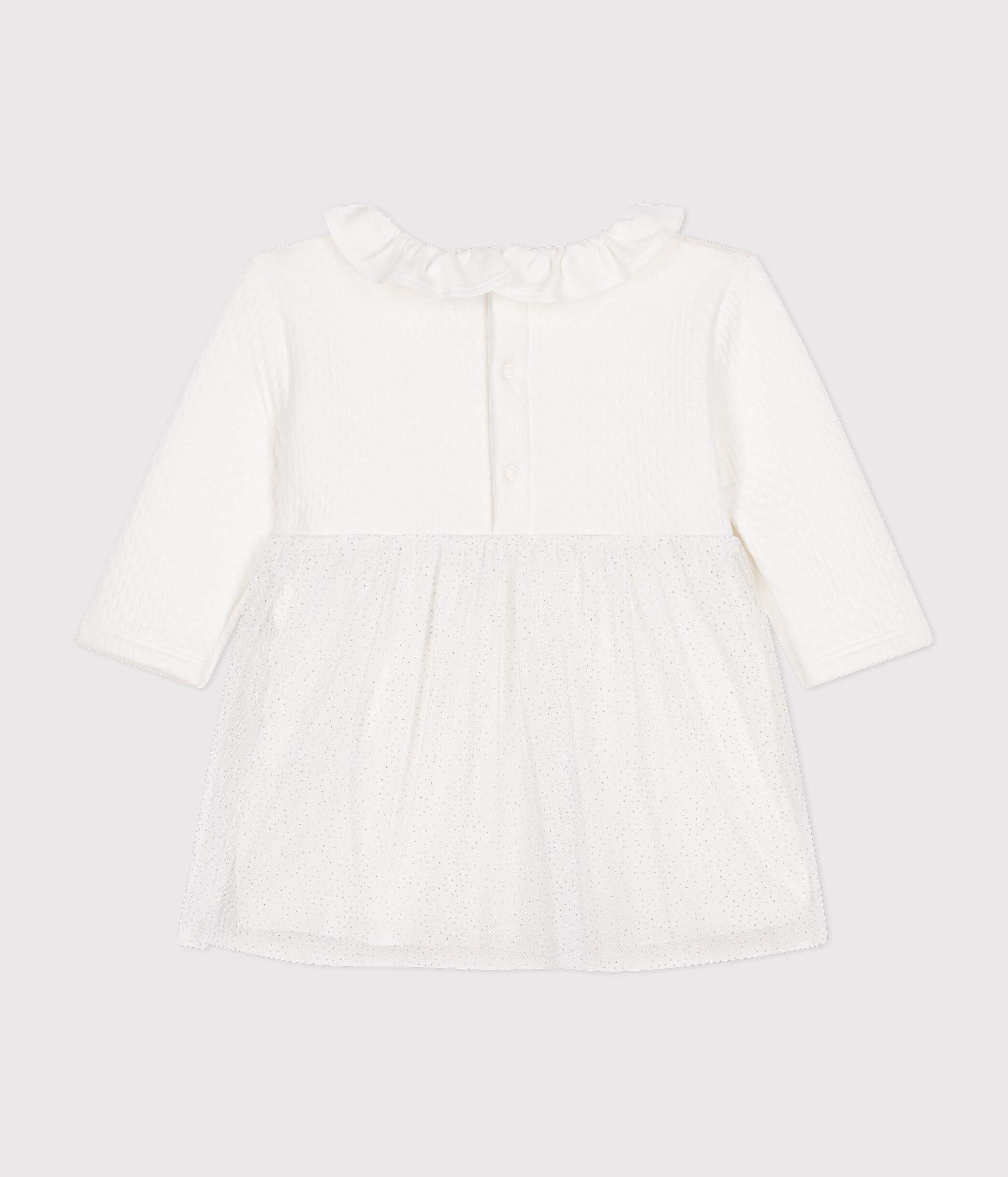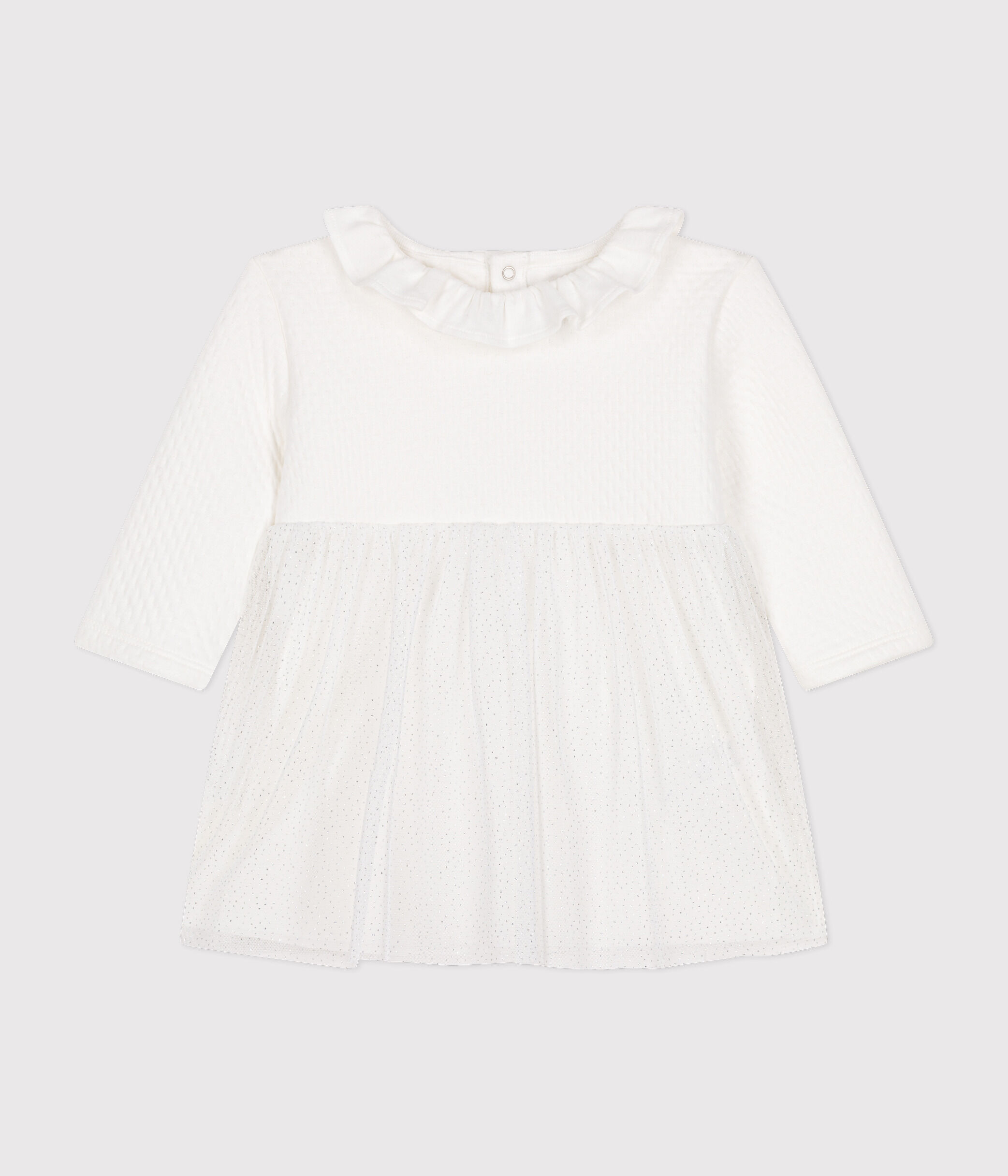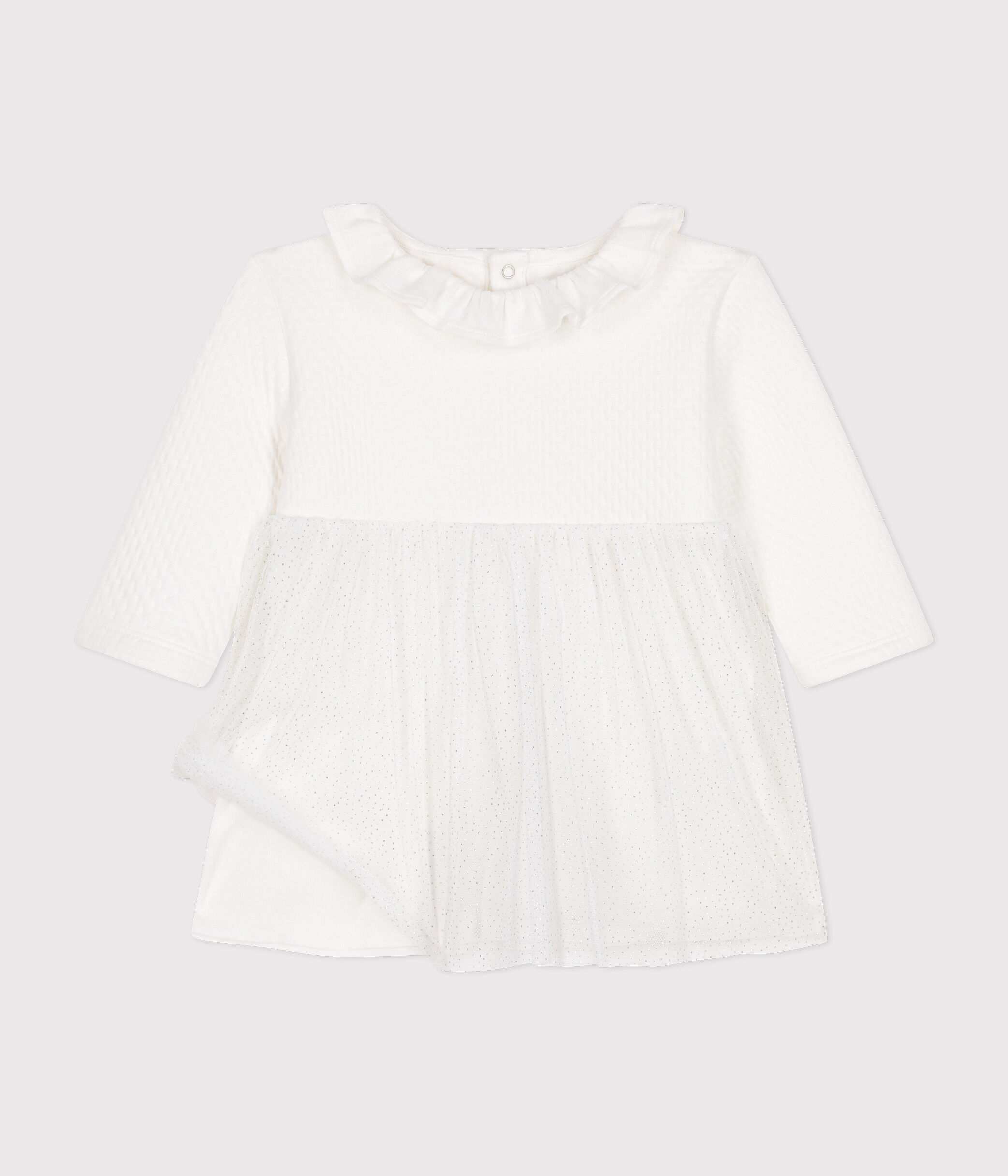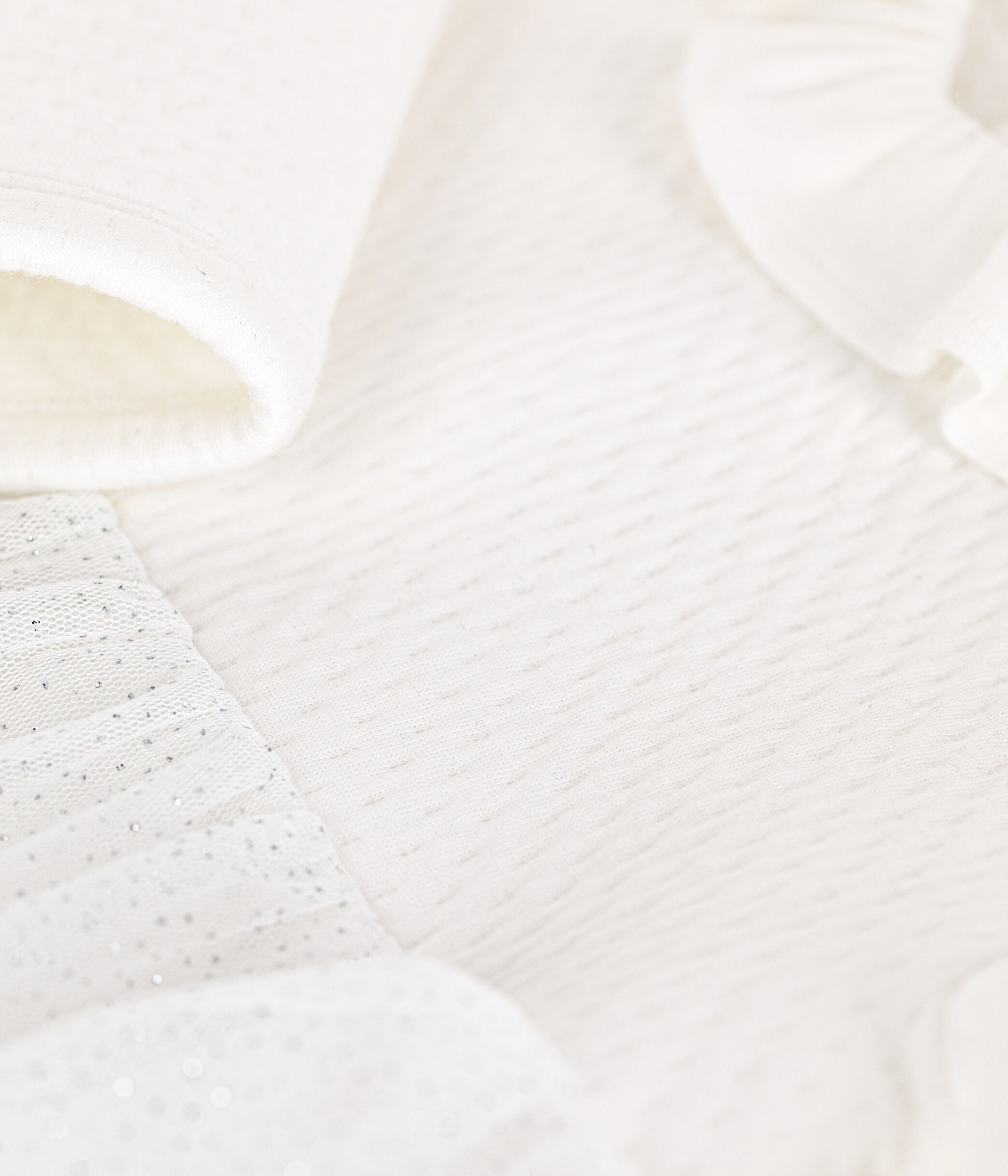Haut de la robe en tubique, l'une des matières innovantes proposée par Petit Bateau. Il s'agit de deux mailles d'une extrême douceur reliées entre elles pour un moelleux unique, qui apporte confort et chaleur grâce à l'air qu'il retient entre ses deux faces.