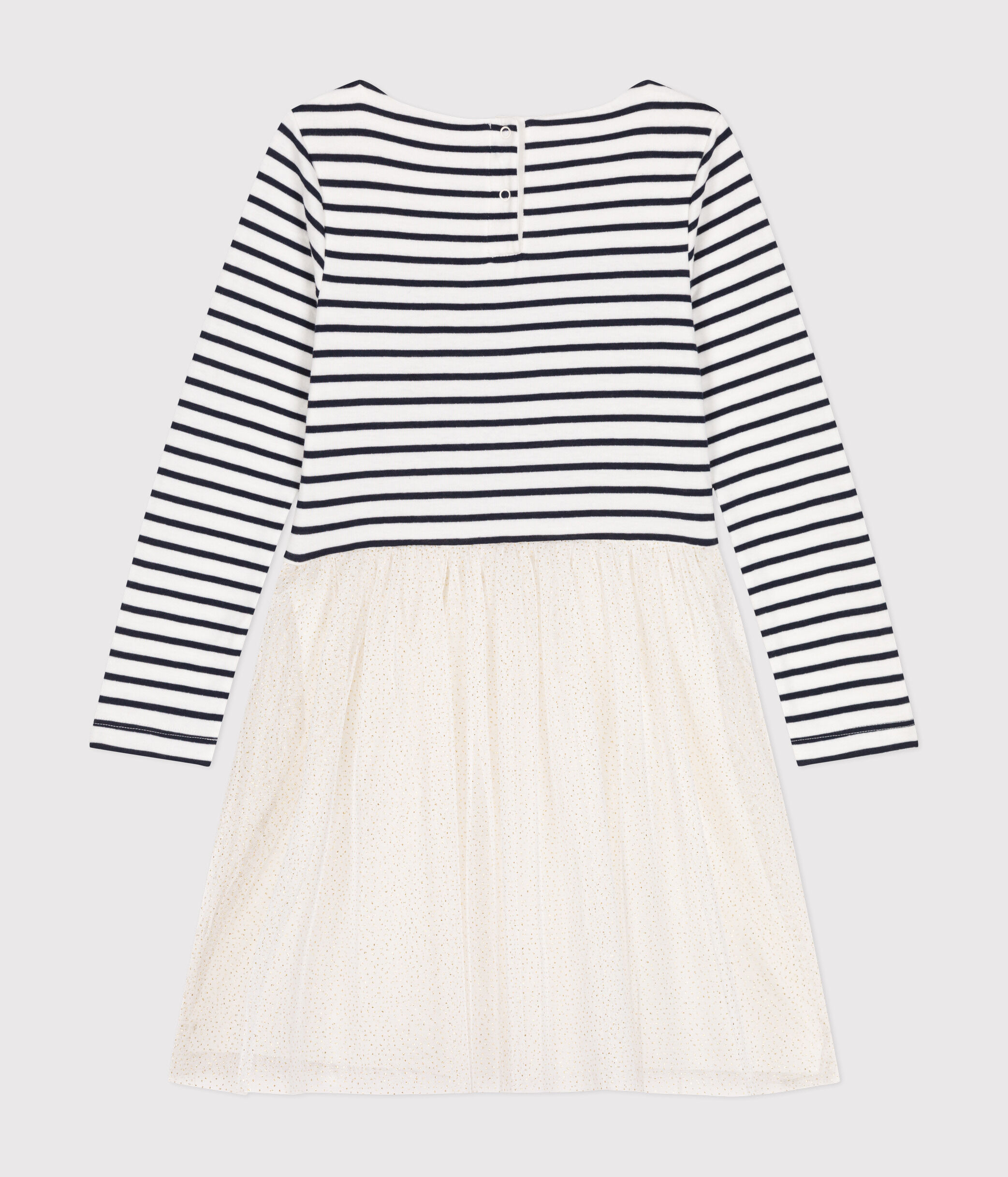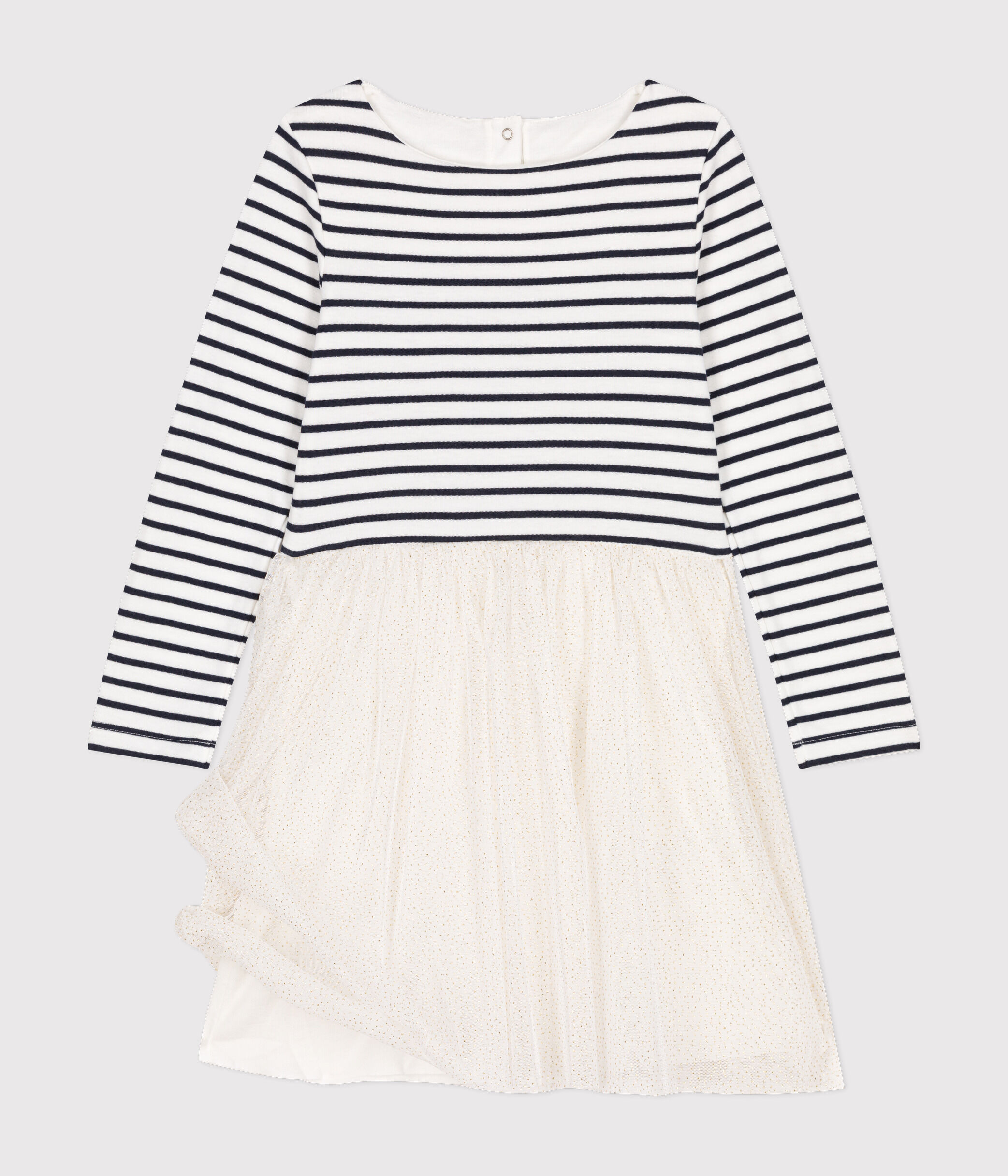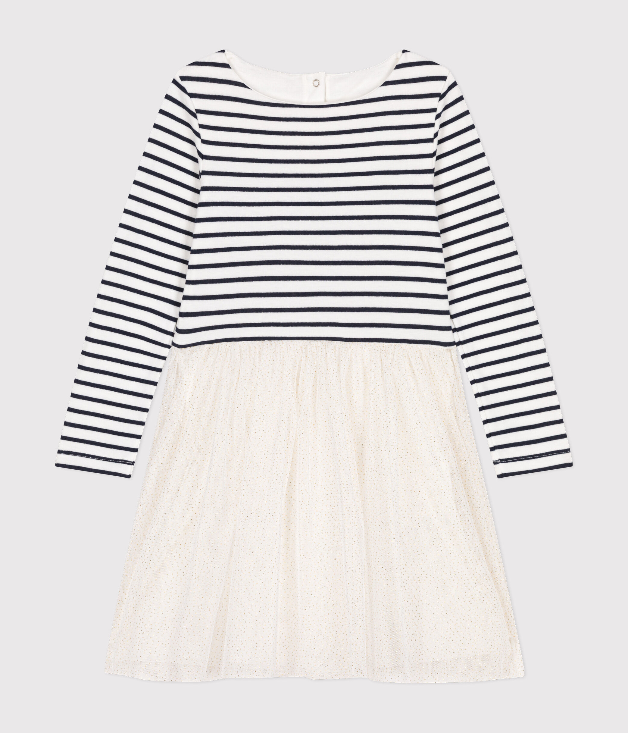 Modèle à manches longues avec une encolure bateau, jupe en tulle pailleté pour donner à cette robe iconique une allure de fête !
