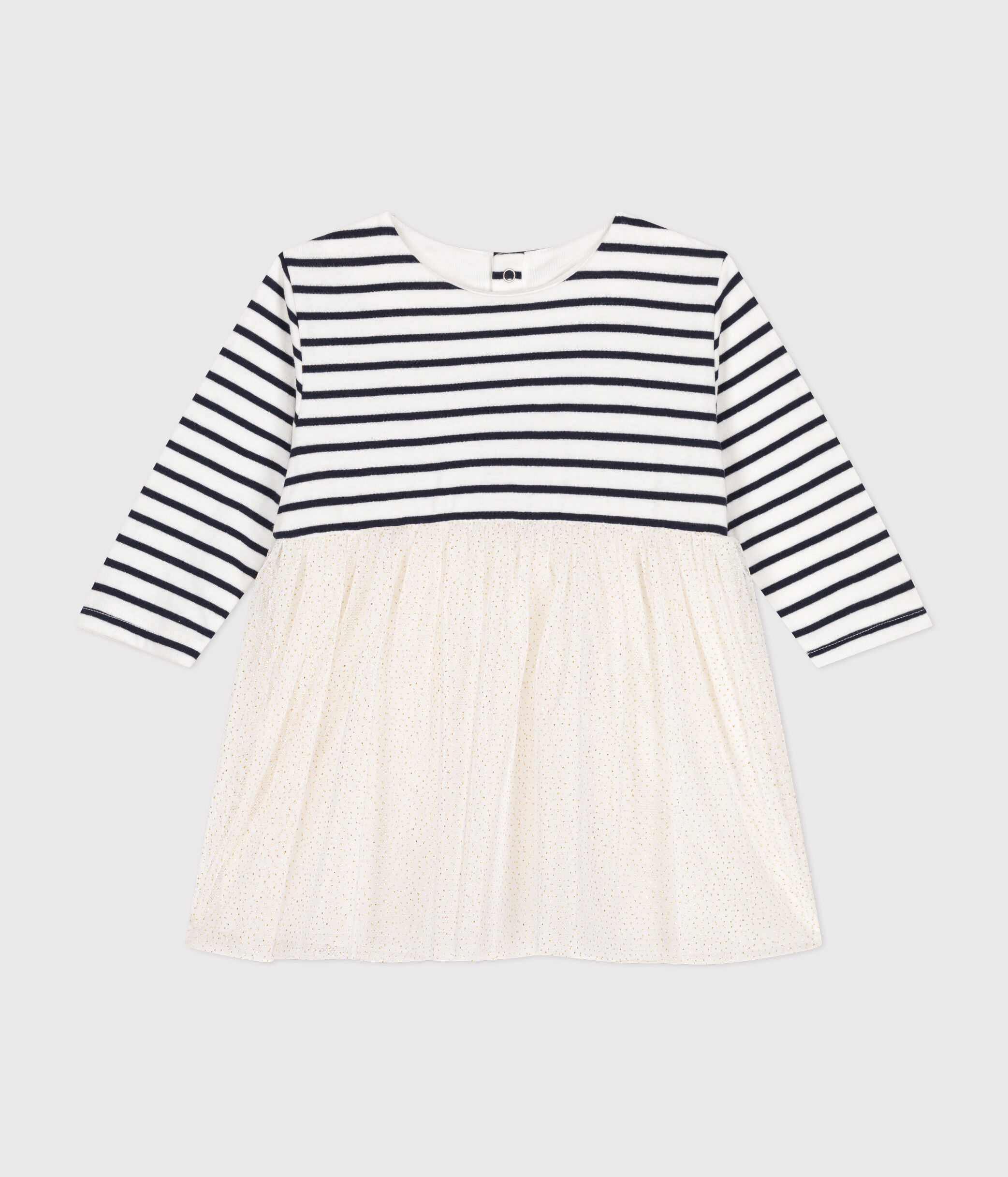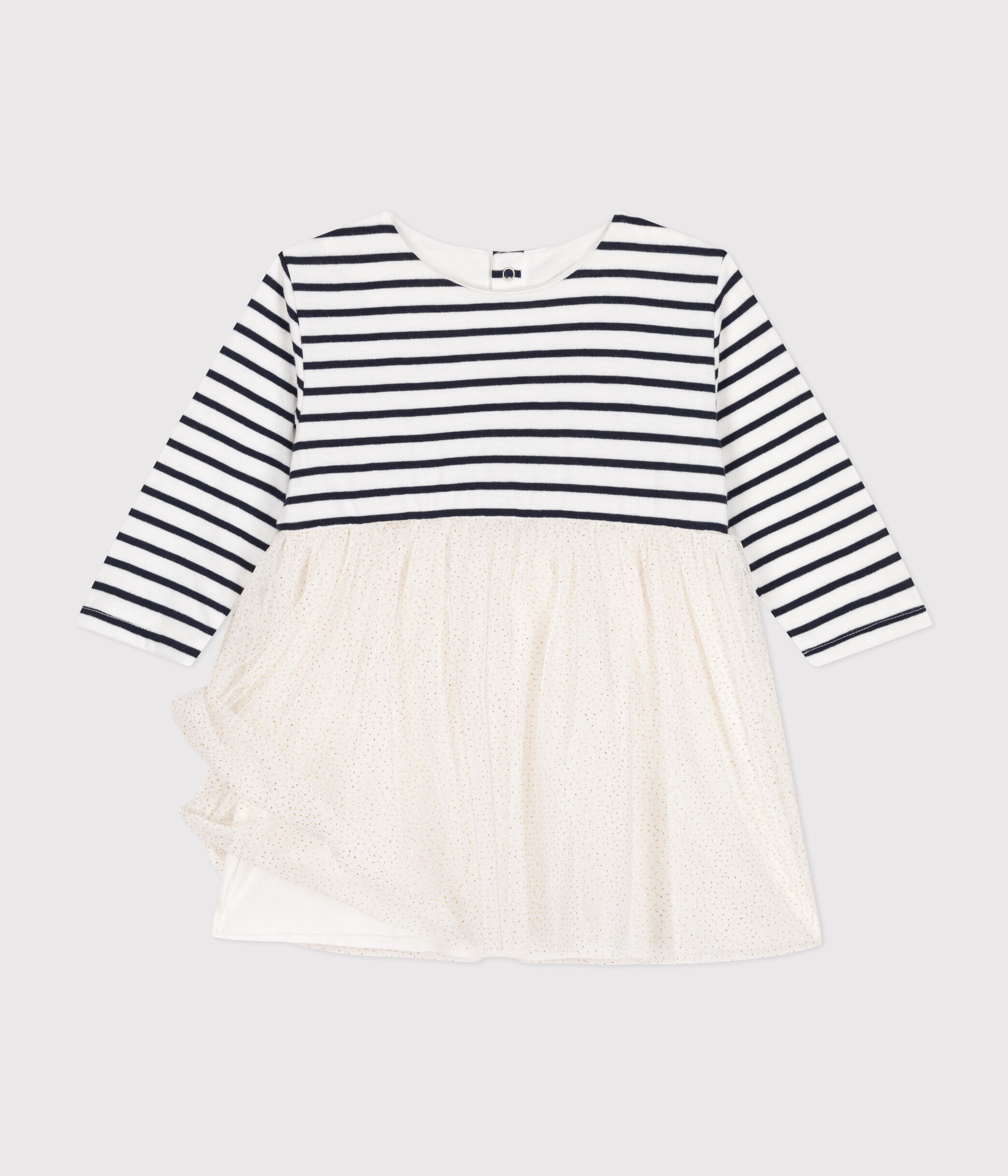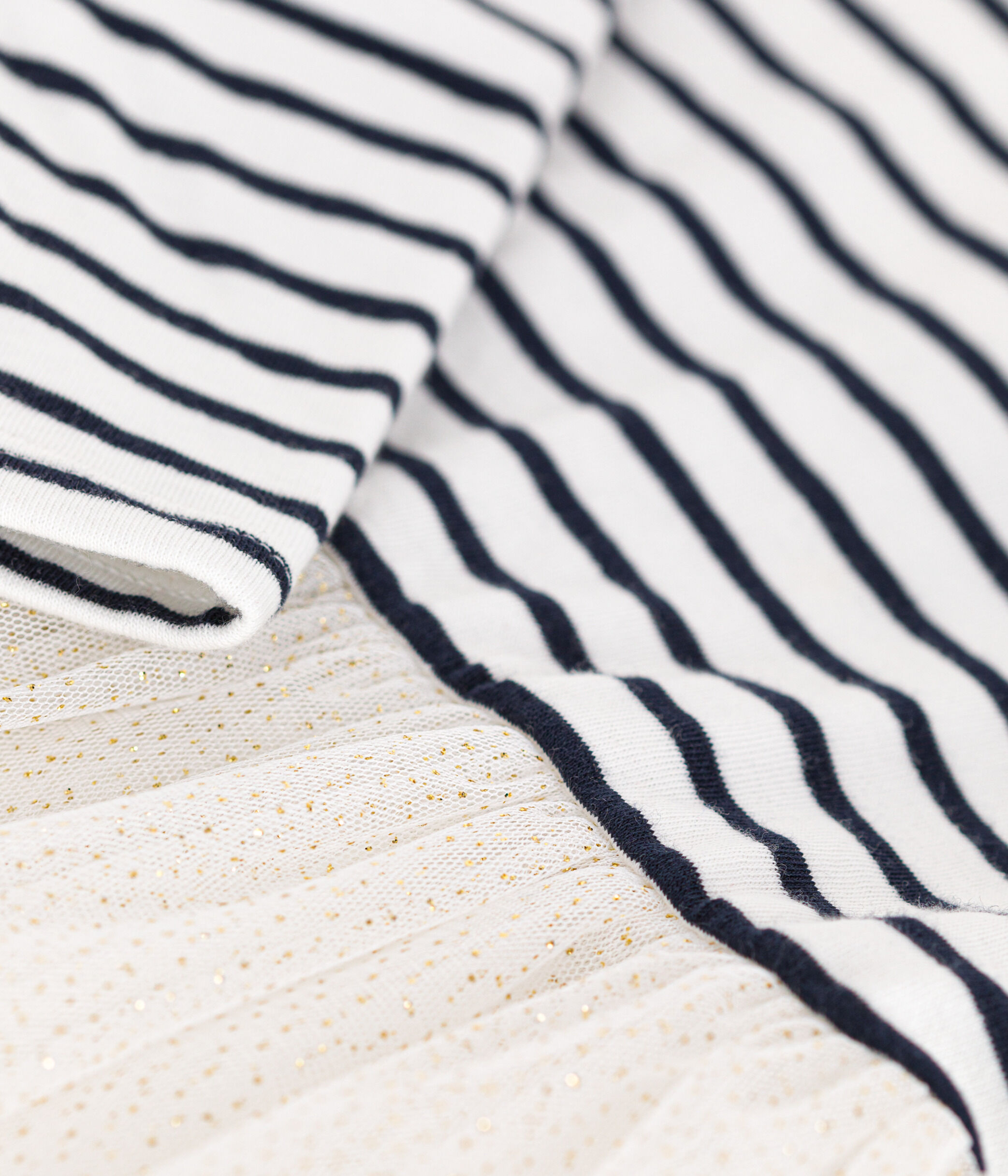 Haut de la robe en tubique, l'une des matières innovantes proposée par Petit Bateau. Il s'agit de deux mailles d'une extrême douceur reliées entre elles pour un moelleux unique, qui apporte confort et chaleur grâce à l'air qu'il retient entre ses deux faces.