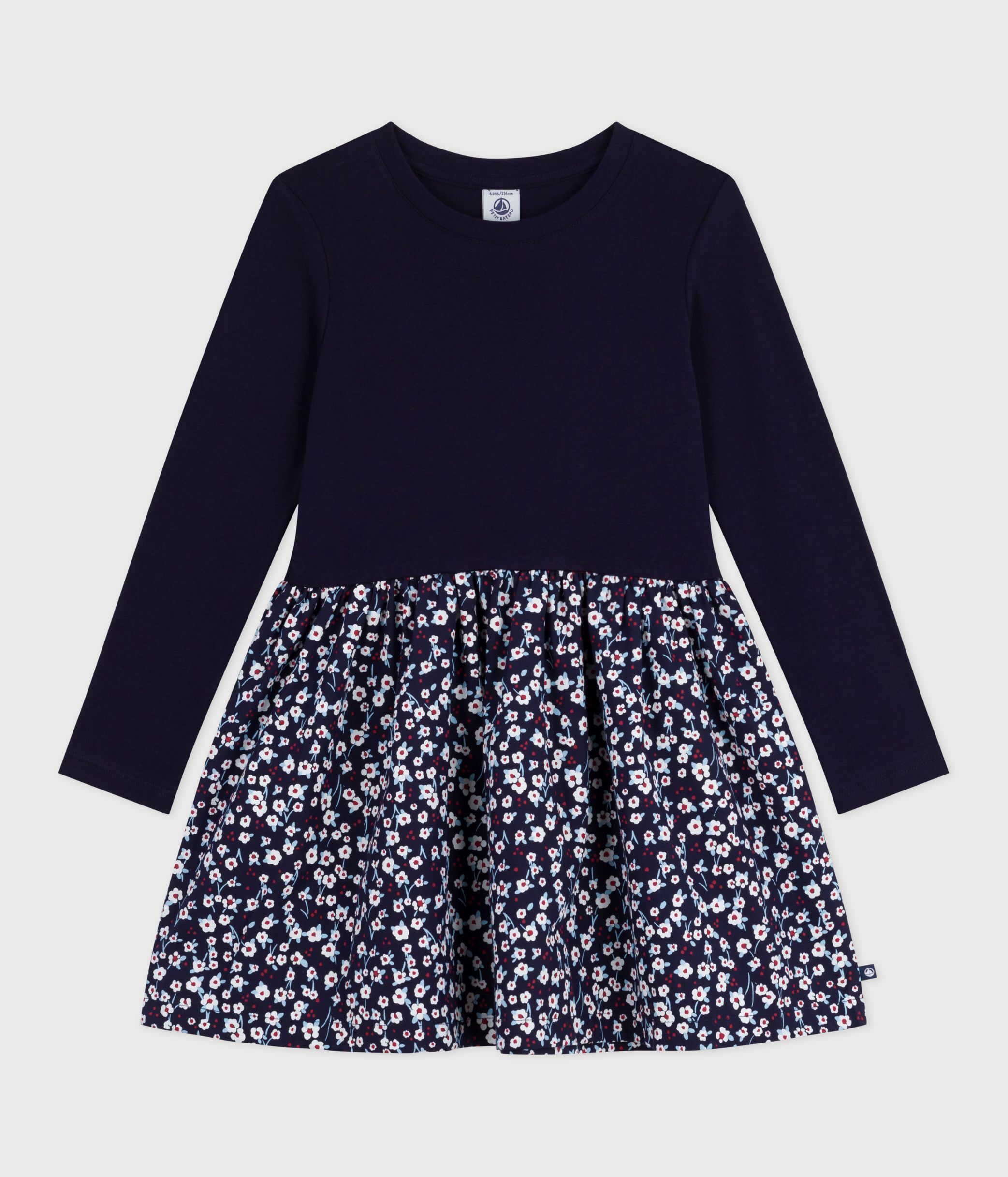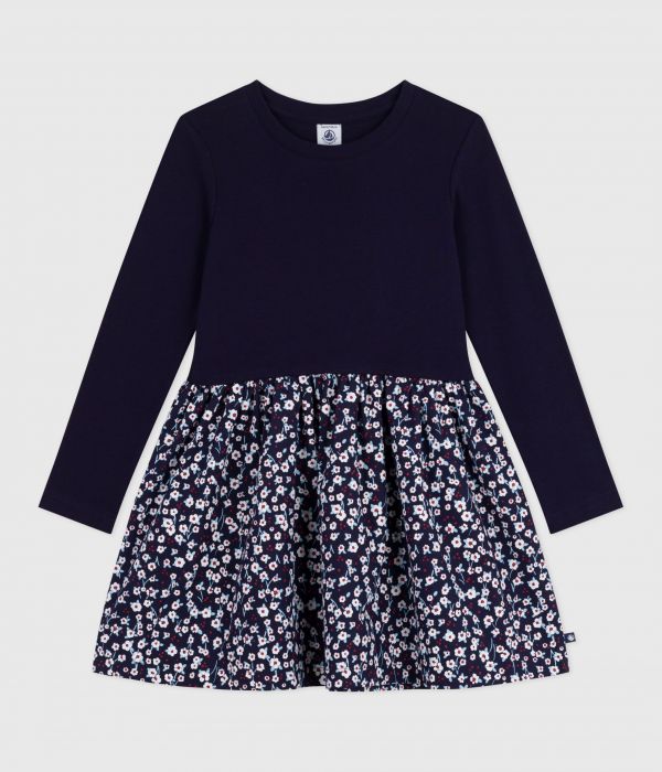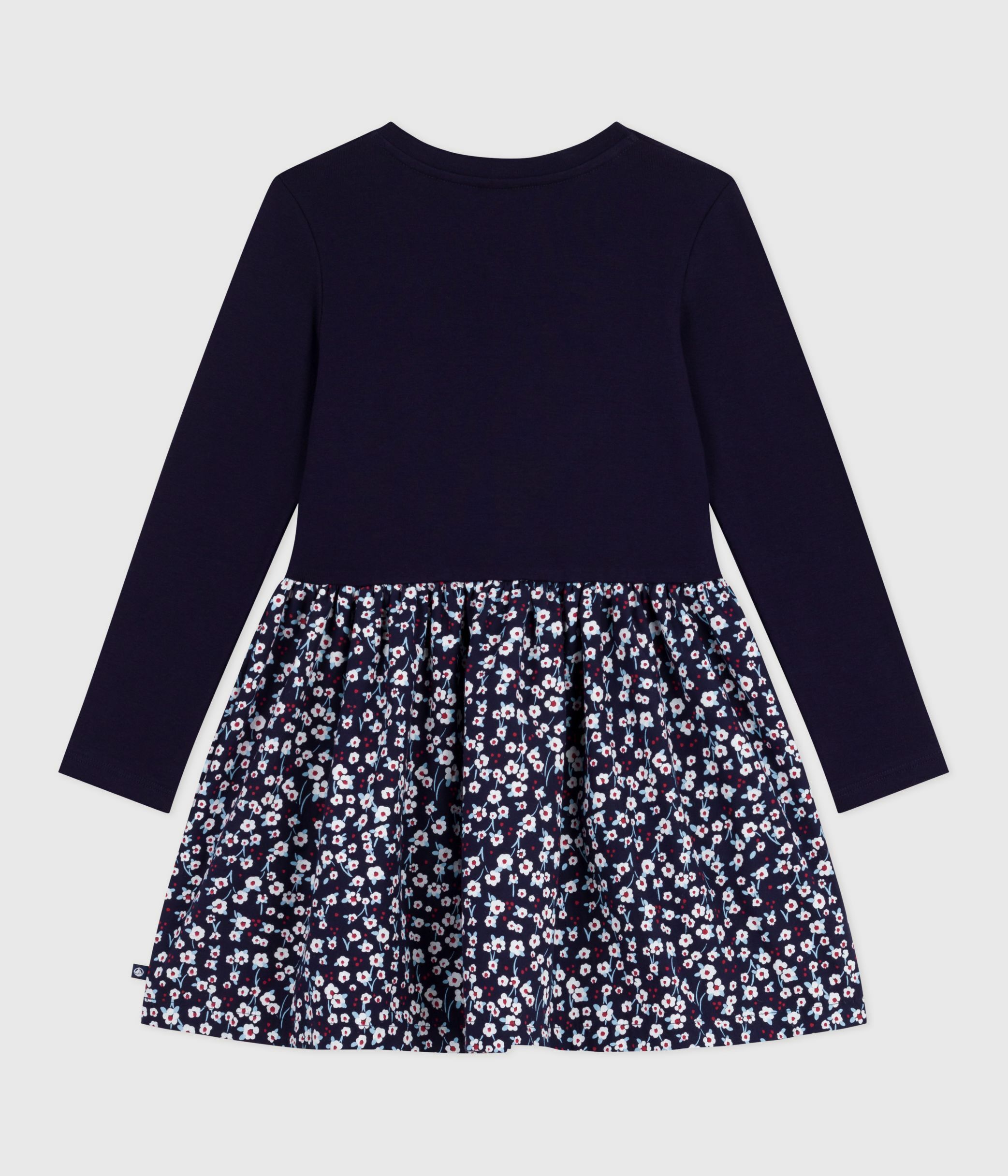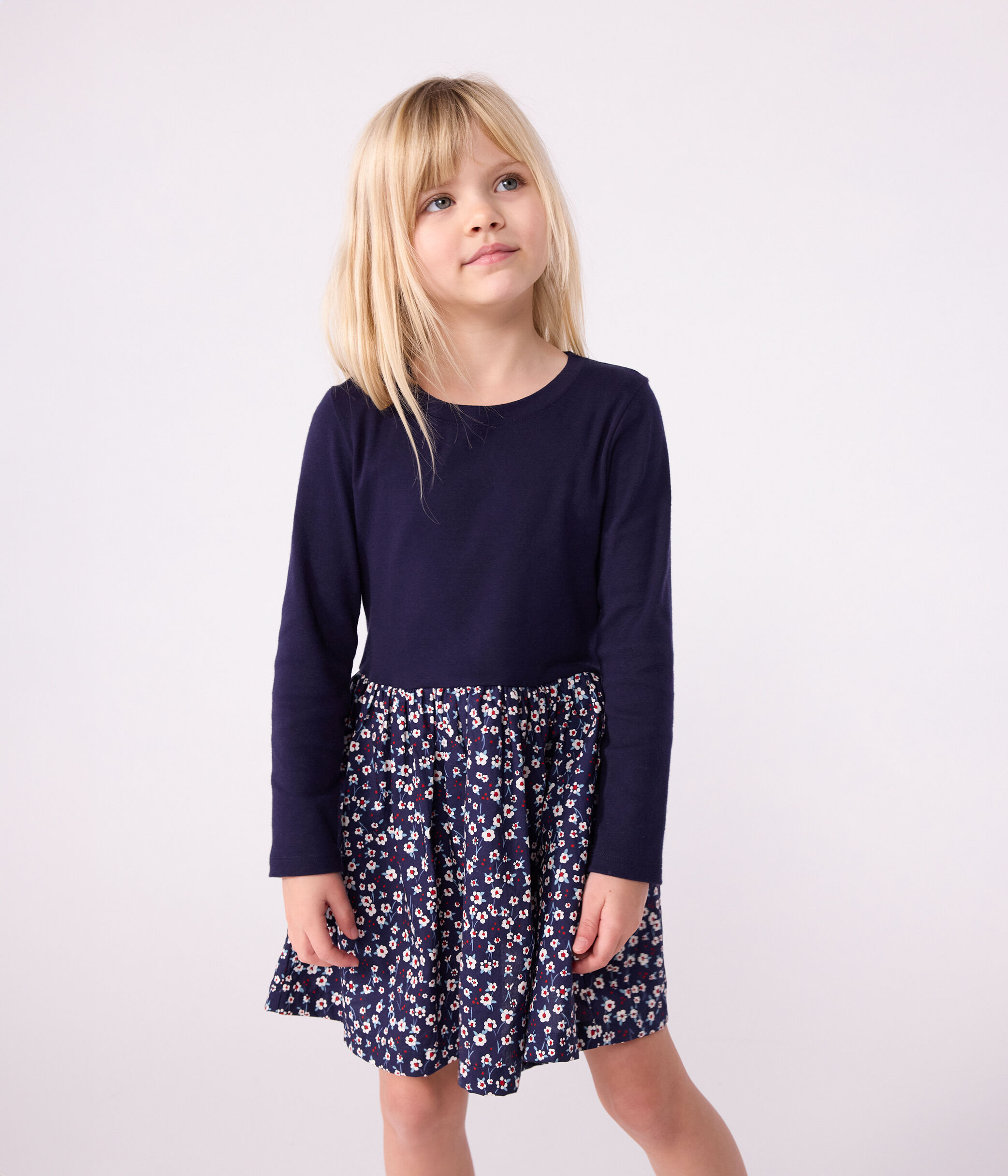 Robe fille bi matière en côte 1x1 et en popeline à motif, une toile légère, fine et souple.
