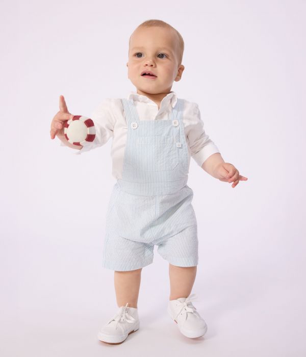 Salopette garçon en seersucker, une matière légère, fine et souple, légèrement gaufrée.