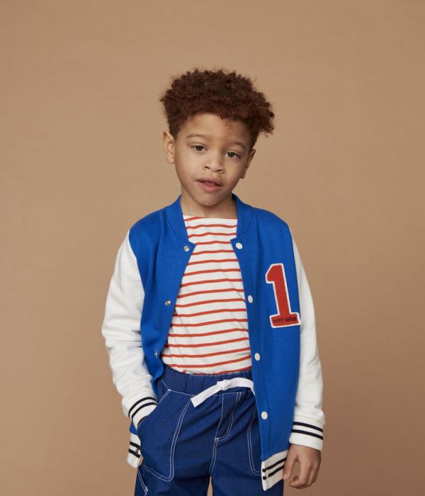 TEDDY EN MOLLETON ENFANT FILLE / GARÇON. Cardigan esprit teddy confectionné en molleton. Cette pièce se démarque par ses coloris contrastés, ses bord-côtes rayés et son badge en bouclette très moderne. Ouverture par pressions siglées sur le devant. Le teddy idéal destiné aux petits garçons comme aux petites filles.